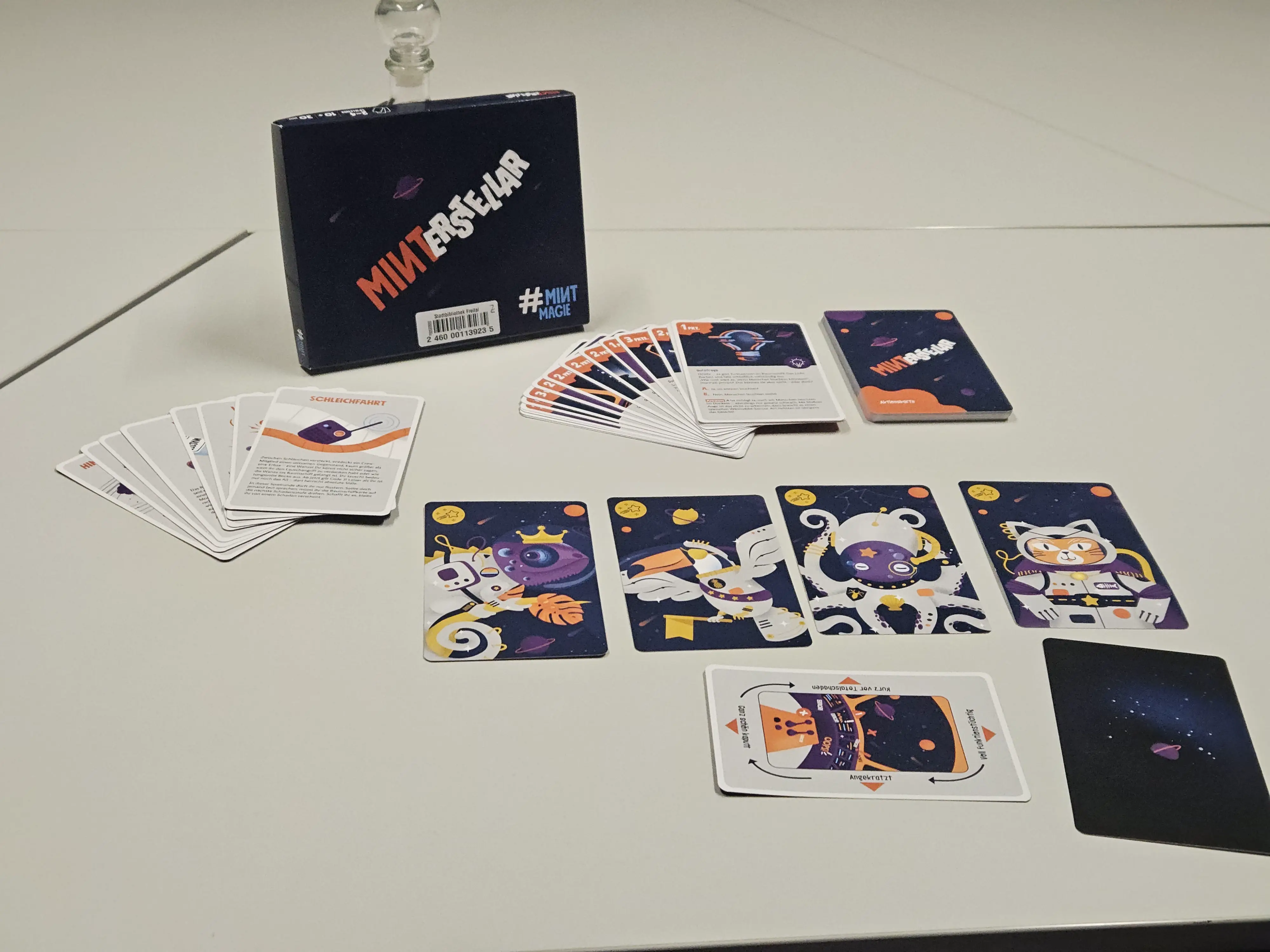 MINTerstellar ist ein kartenbasiertes Wissens- und Aktionsspiel, bei dem die Spieler Aktionskarten ausspielen, um Punkte zu sammeln und um mit ihrem Raumschiff zum schwarzen Loch zu reisen.