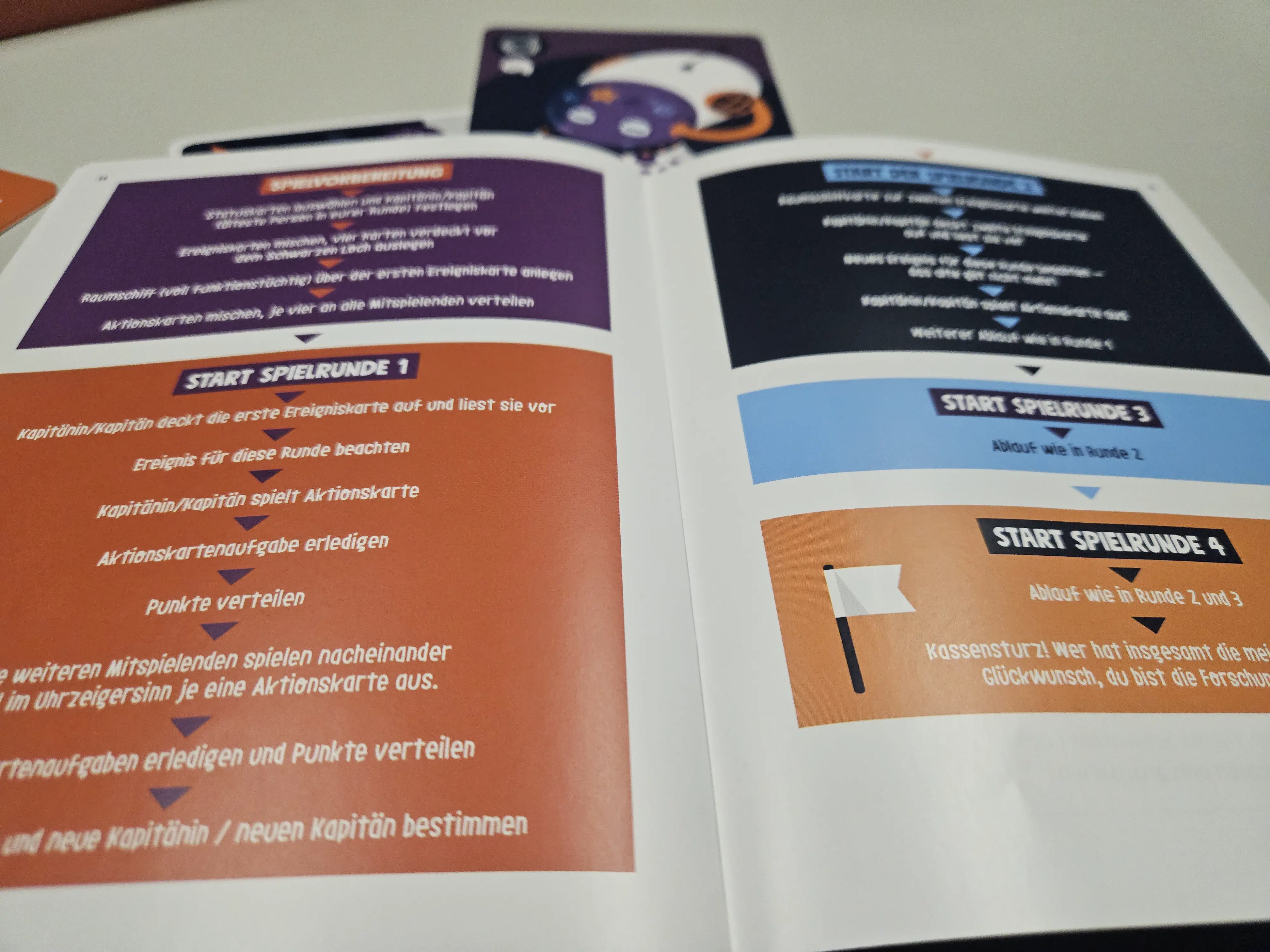 “Vor jedem Satz Himbeer-Milchstraße sagen”, “Vor jeder Aktionskarte einmal springen”, “Die Gestik des Kapitäns nachmachen” sind einfach komische und kindische Aktionen, die zwar im Spielkontext erklärt werden, aber überhaupt nicht in den Spielfluss passen. Einige Ereignisse spielen auch mit der Punkteverteilung und dem Kapitänsstatus, diese sind ganz ok.